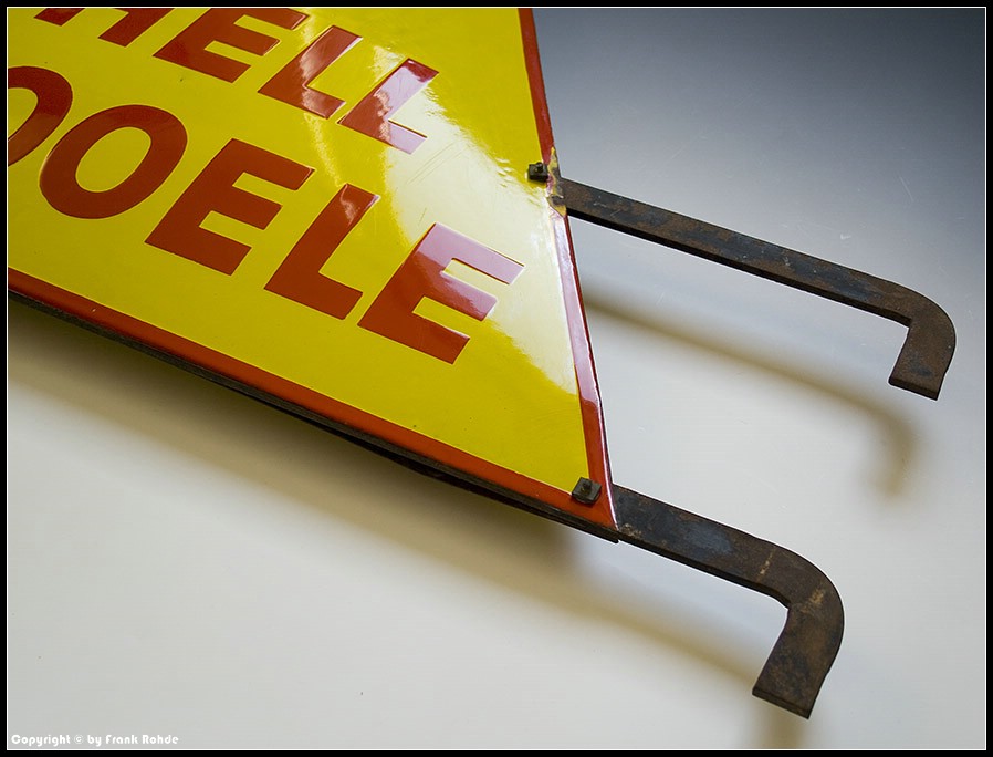 | Beschädigungen: | das Schild hat einige Abplatzer am äußersten auch seitlich abgekanteten Rand und im Bereich der unteren Aufhängelaschen. Leider ist das Schild außerdem in sich verzogen |