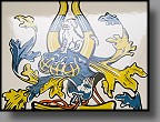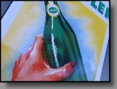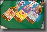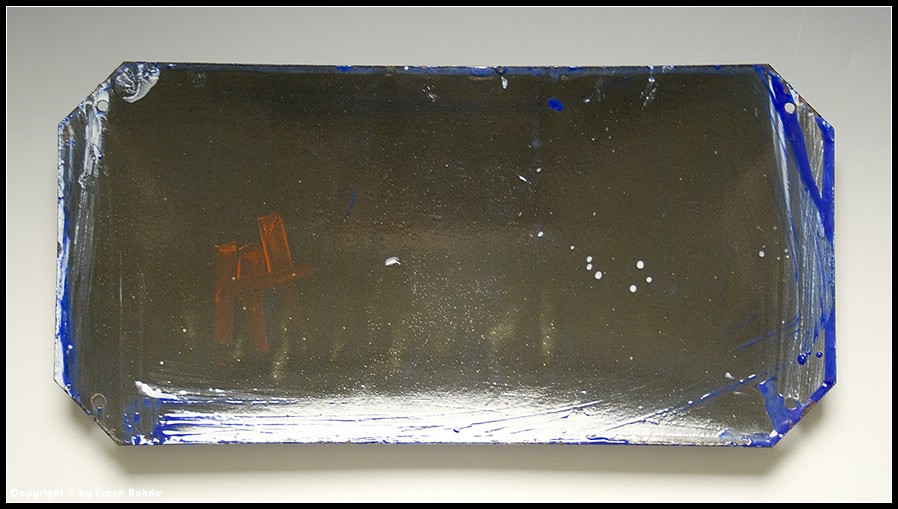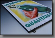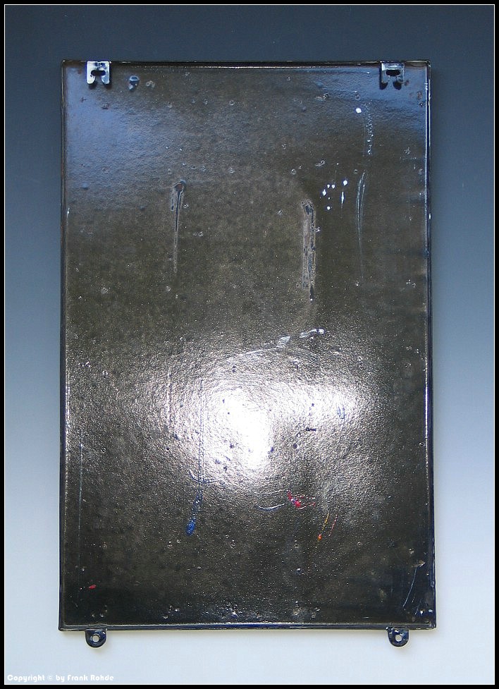 | Beschädigungen: | es gibt zahlreiche kleine Beanstandungen/Abplatzer am äußersten abgekanteten Rand, außerdem Schäden im Eckbereich linken unten links. Im Motivbereich der Flaschen befinden sich unzählige kleine Herstellungsbedingte Emaillierfehler, waren wohl kleine Luftblasen, die beim brennen aufgeplatzt sind... |
