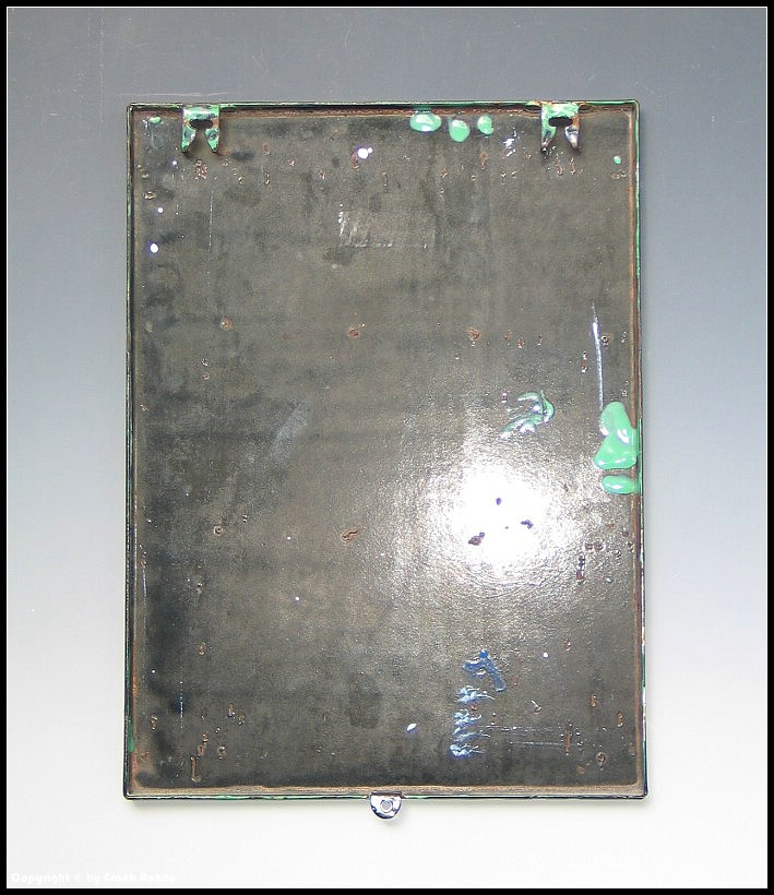 | Beschädigungen: | nur am äußersten abgekanteten Rand gibt es ca.5 kleine Beschädigungen, außerdem sind die beiden unteren Aufhängelaschen minimalst beschädigt, die Rückseite ist sehr schön erhalten |