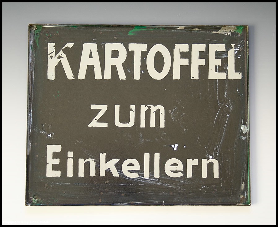 | Besonderheiten: | außer Emailklecksen befindet sich auf der Rückseite mit Ölfarbe aufgetragene Hinweis: "KARTOFFEL zum Einkellern". Sehr selten angebotenes Bierschild |