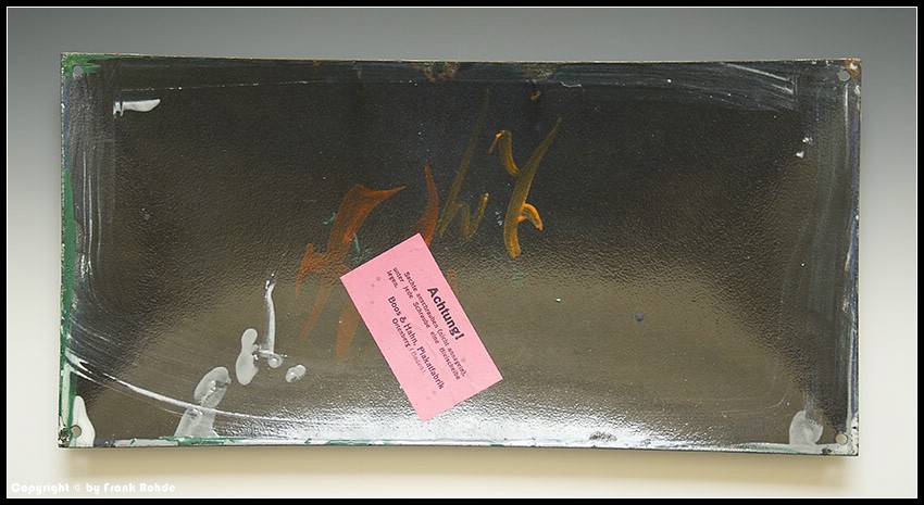 | Besonderheiten: | schöne Rückseite mit Emailschlieren und dem Original Montagehinweis aus Papier...selten angebotenes Brauereischild in toller Erhaltung |