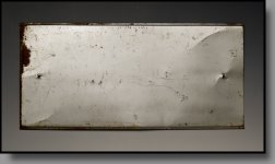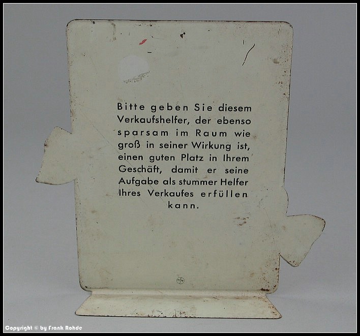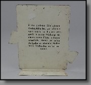 | Besonderheiten: | dort wo sonst ein handelsüblicher Abreißkalender an den 2 länglichen Löchern angebracht war gibt es auch Beschädigungen und Risse, außerdem noch kleinere am äußersten Rand. Es handelt sich hier um ein sehr selten angebotenes Schild, mir persönlich ist kein weiteres Exemplar bekannt ! |