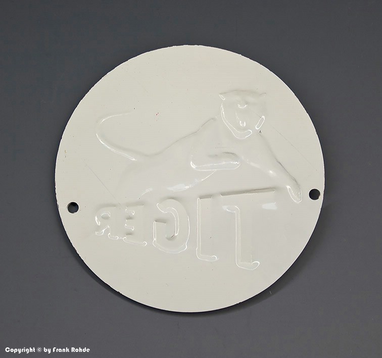| Besonderheiten: | der "Tiger" sowie der weiße Schrift sind sehr stark geprägt und "fühlbar erhaben". Die Bilder stammen von einem bereits verkauften Schild...Sie erhalten aber ein Schild in gleichwertig guter Erhaltung wie abgebildet. Bitte beachten Sie das die kleinen Makel auf der lackierten Oberfläche ein wenig von den Abbildungen abweichen können |