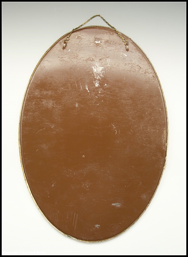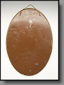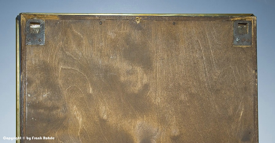 die Rückseite ist mit Blech hinterlegt. Rückseitig ist noch die Original Aufhängekette aus Metall vorhanden |