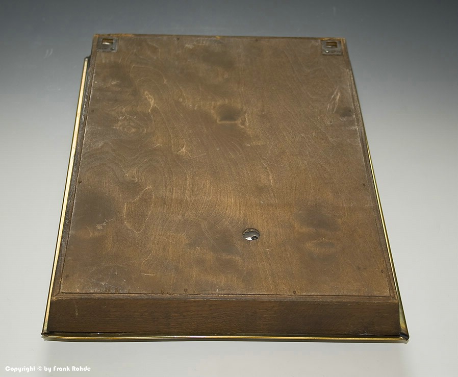 | Besonderheiten: | sehr selten, kenne persönlich KEIN weiteres Exemplar in dieser Ausführung ! Die Rückseite ist mit Pappe und Kunstleder hinterlegt. Rückseitig ist noch das Original Aufhängeband vorhanden, das Schild kann auch durch die 2 am unteren Rand vorhandenen kleinen Blechnasen als Aufsteller genutzt werden, diese sind durch Splinte gesichert und bisher noch nicht herumgebogen worden ! |