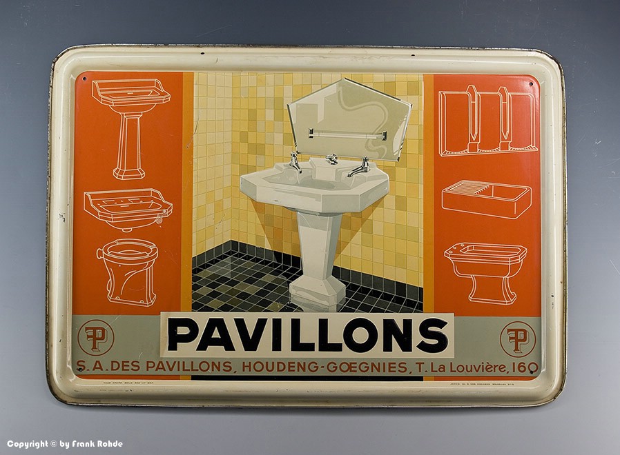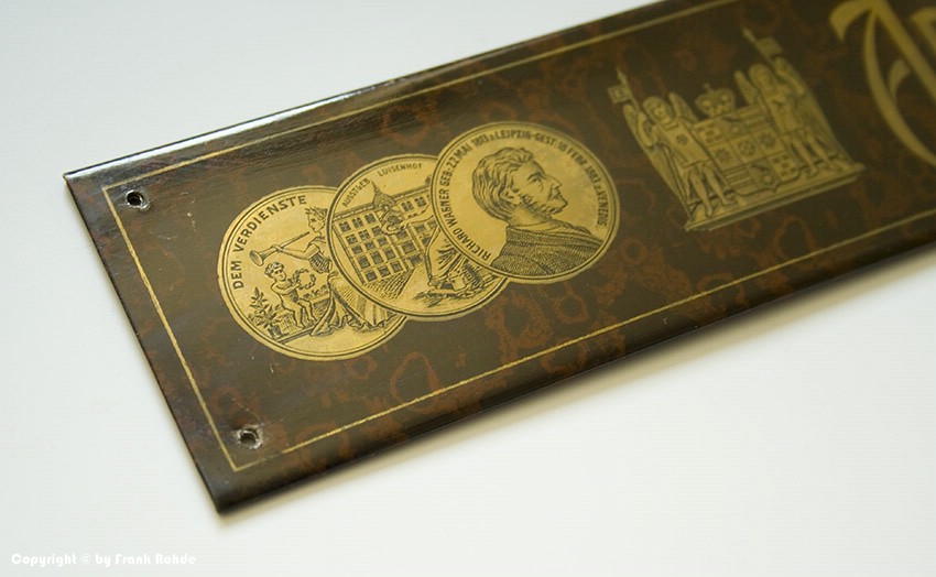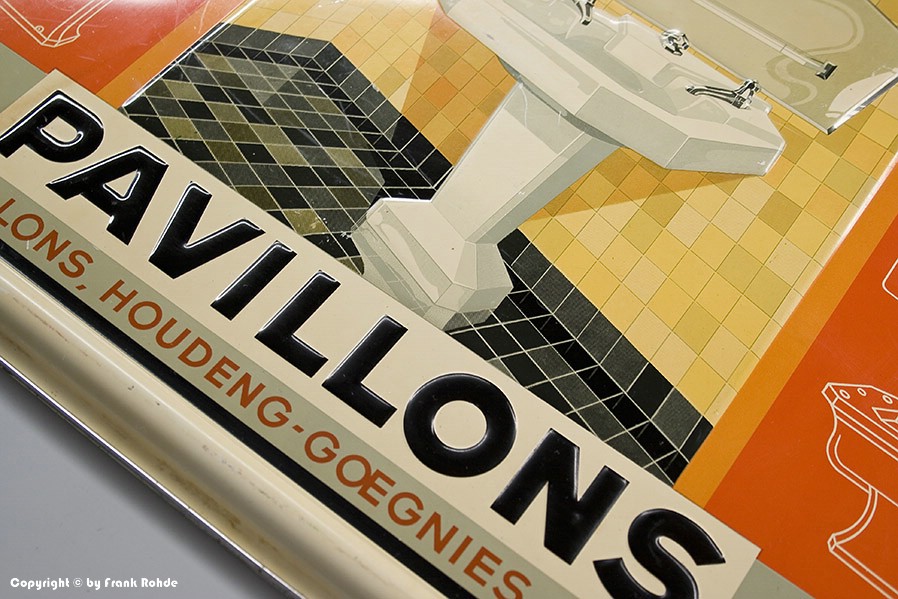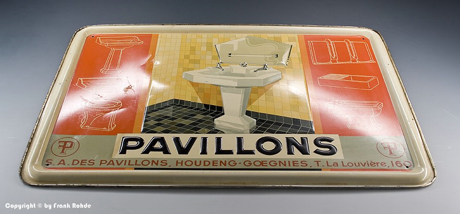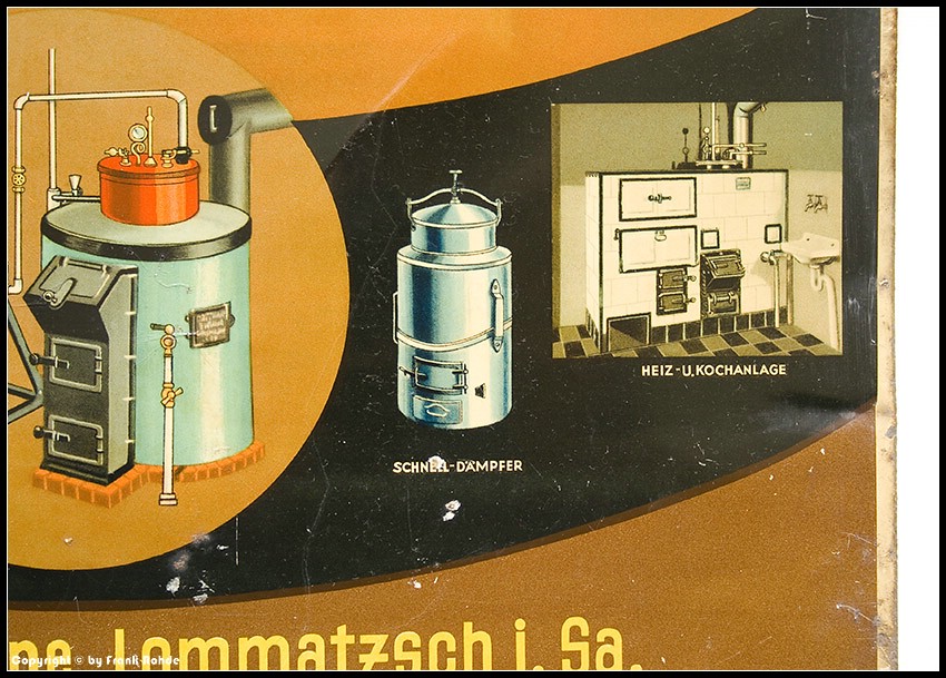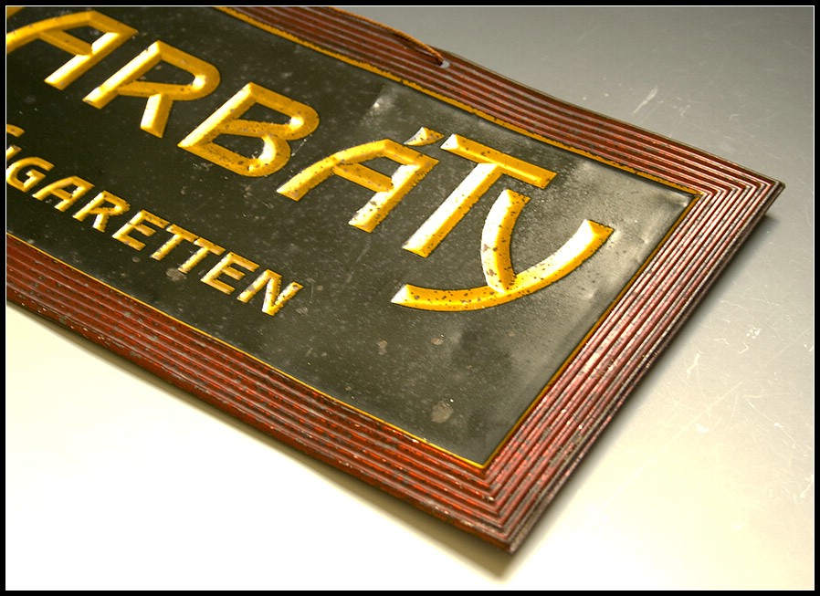 | Besonderheiten: | es handelt sich hier um ein sehr selten angebotenes Schild, mir persönlich ist kein weiteres Exemplar in dieser Ausführung bekannt ! Insgesamt ein sehr kurioses Stück mit wunderschöner Abbildung. Die späten Art Deko Elemente finden sich hier wieder |