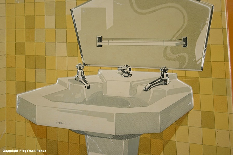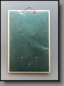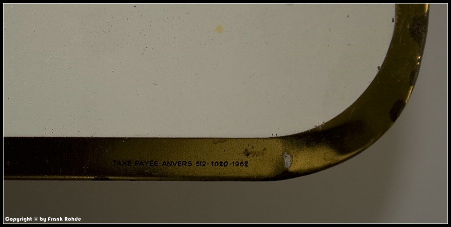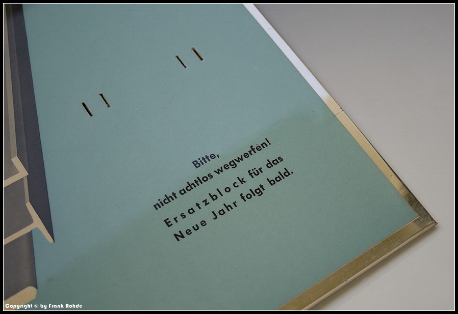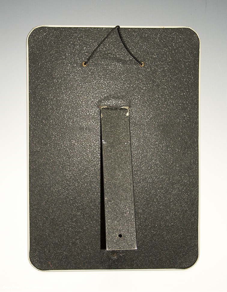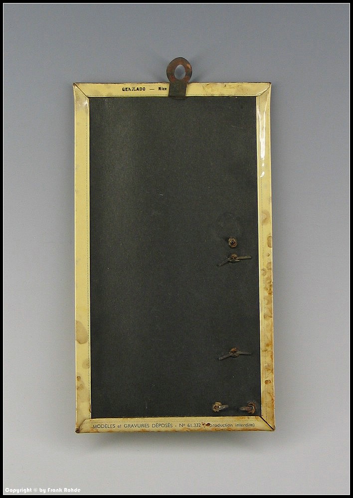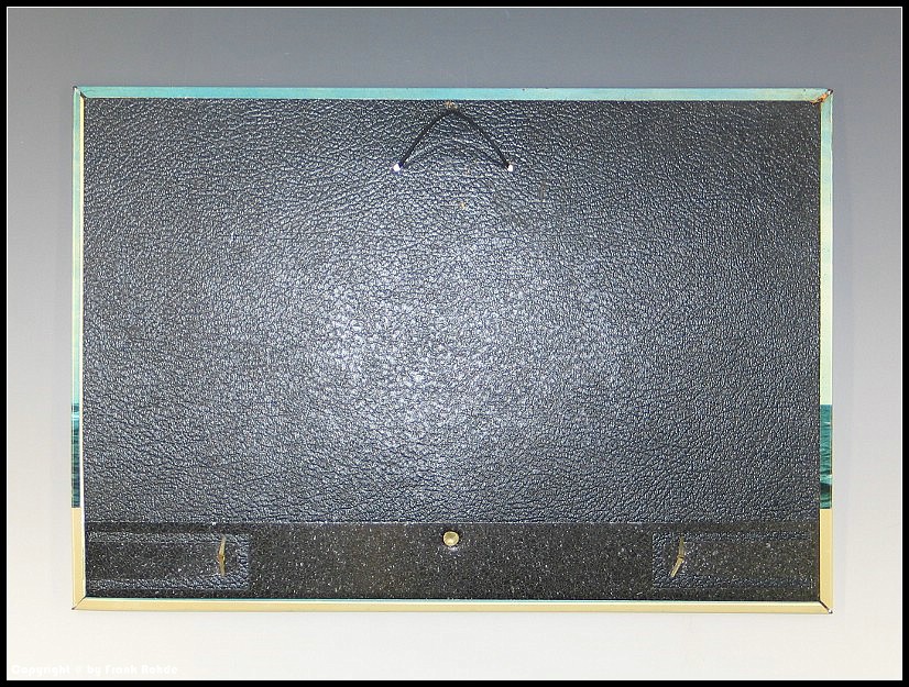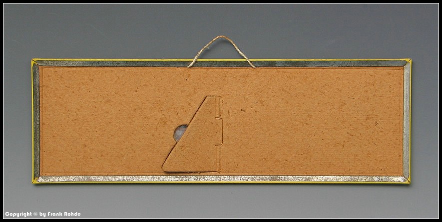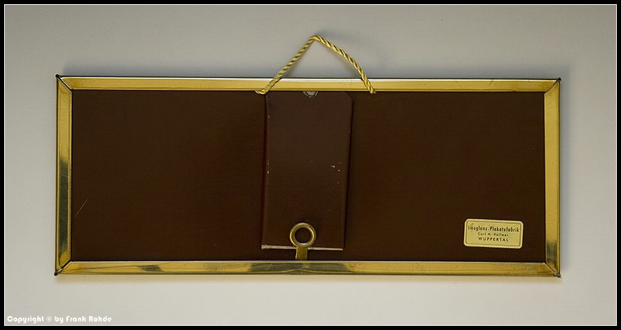 | Besonderheiten: | der äußerste Rand ist unter der Kunststoffoberfläche verchromt, was auf den Bildern nicht so richtig rüberkommt. Im rechten unteren Bereich gibt es 4 längliche Aufnahmestellen für einen Abreißkalender, der allerdings verschollen ist. Auf der Rückseite sind 2 Aufhängeösen aus Metall, sowie eine Aufhängekordel vorhanden. Ein kurioses Objekt, von dem seinerzeit wohl nicht allzu viele hergestellt wurden. Hier vielleicht das letzte noch erhaltene Exemplar überhaupt ! |