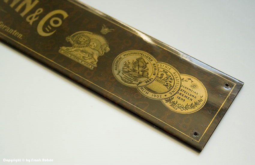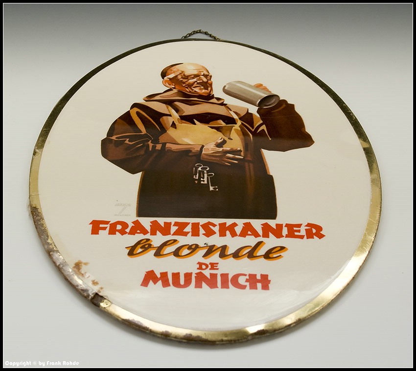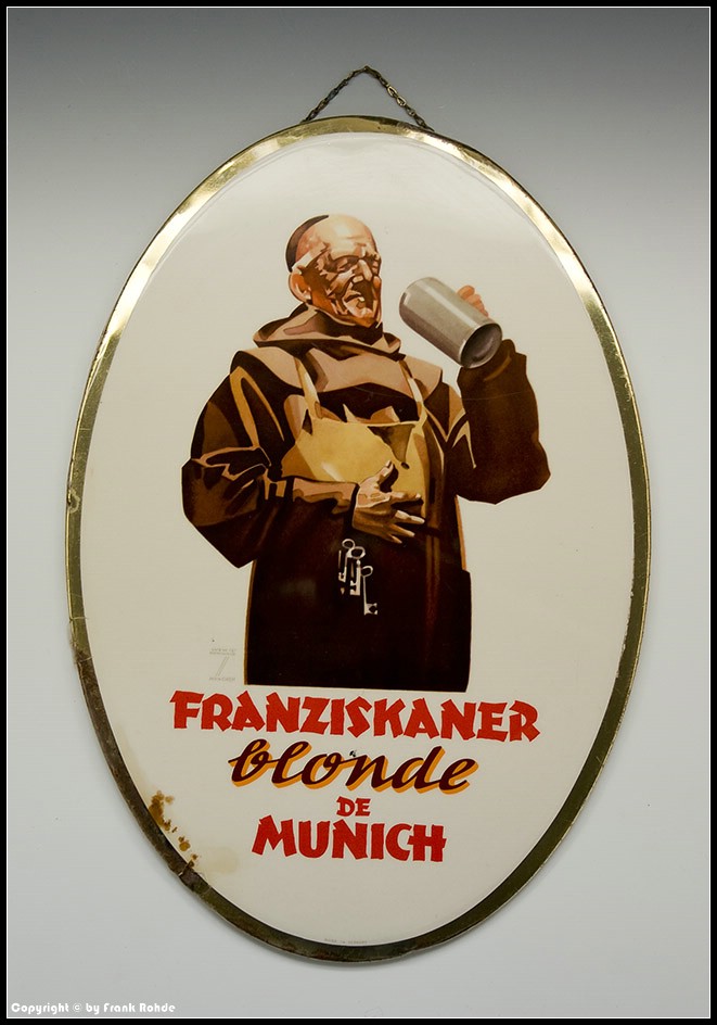 | Besonderheiten: | das Blechschild ist recht massiv, vermutlich aus Messing gefertigt !? Die Schrift, die Flasche, sowie der umlaufende schwarze Rand sind fühlbar erhaben. Die Machart erinnert stark an sog. "Tresor Typenschilder" um 1900. Selten angebotenes Stück mit wunderschönem Motiv und reichlich kleinem Text...für alle Reklamesammler...Bitte beachten Sie, dass die Bilddateien von einem bereits verkauften Artikel stammen, Sie erhalten ein Schild in ähnlich guter Erhaltung wie abgebildet ! (hier und da können die MINIMALEN Makel vom Schild abweichen, das hier angeboten wird). |