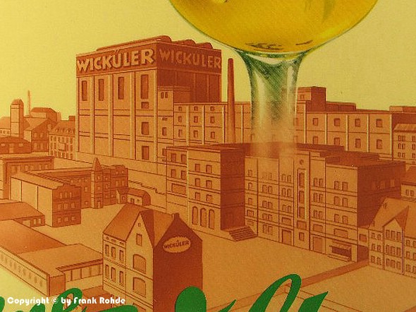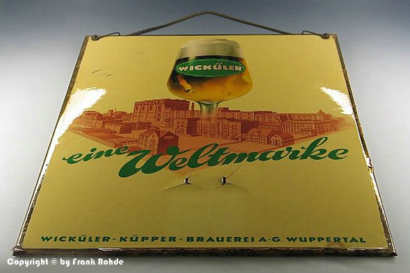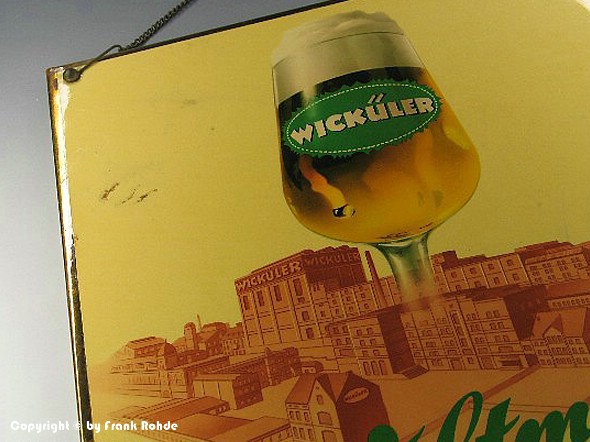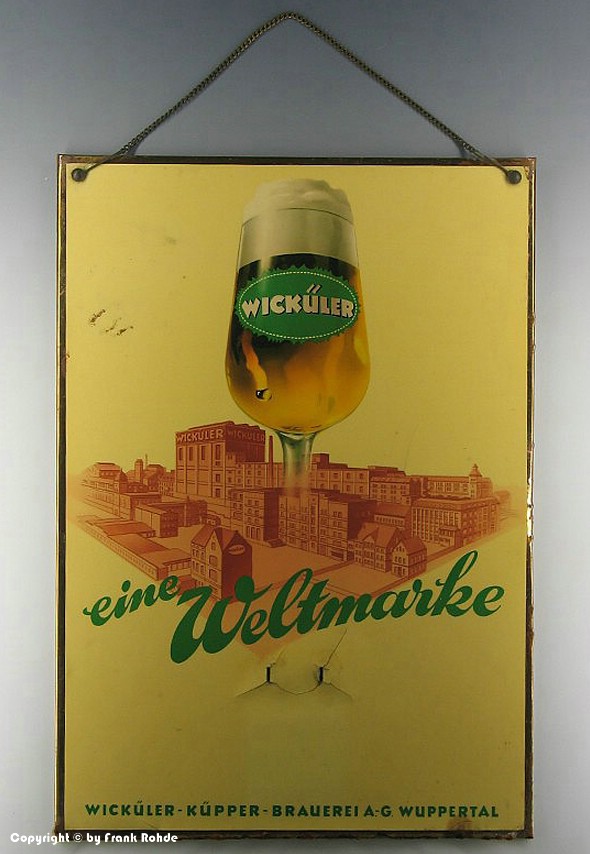 | Schild ist: | die Kalenderrückwand ist flach mit Motiv der Wuppertaler Brauerei Wicküler, die Oberfläche ist vorn mit einer dünnen Schicht Kunststoff überzogen (ist Original so), wird auch Emailoid, oder Imoglas genannt, die Rückseite ist aus Blech. |