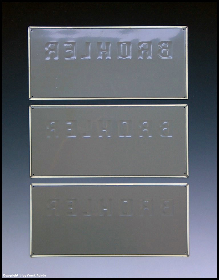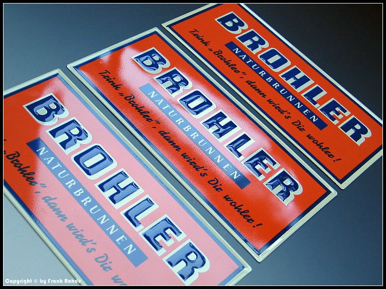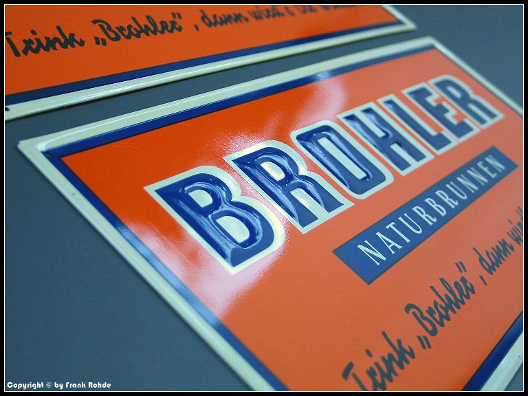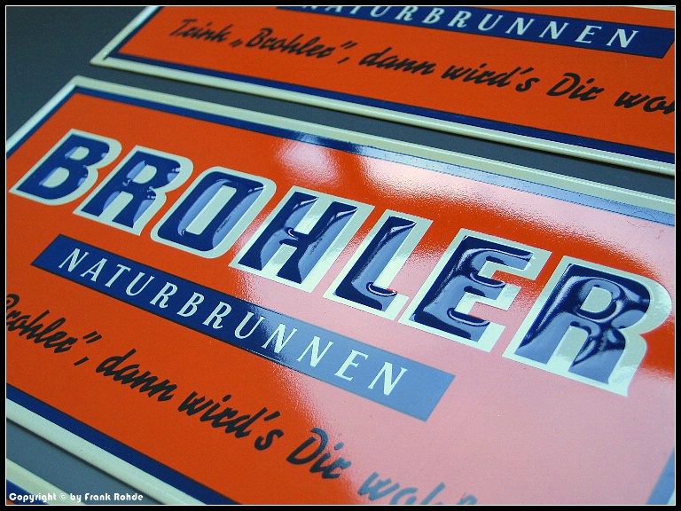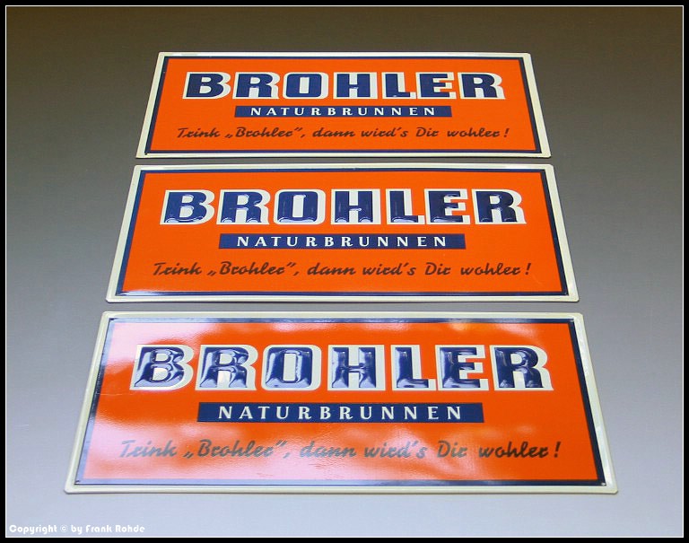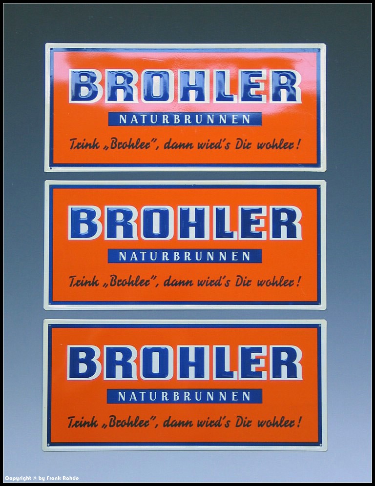 | Blechschild ist: | sind flach, der Schriftzug "BROHLER" ist stark, der Rand ringsum leicht geprägt |