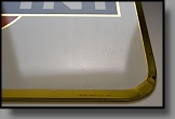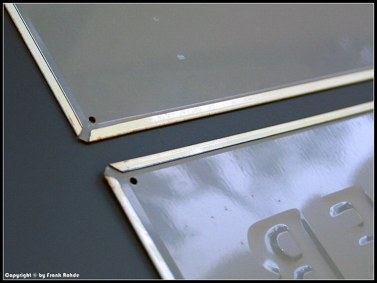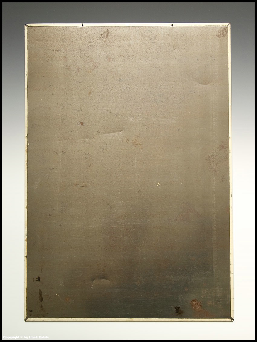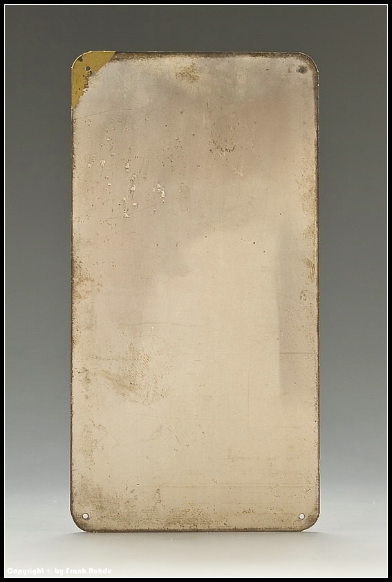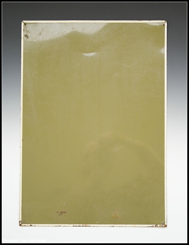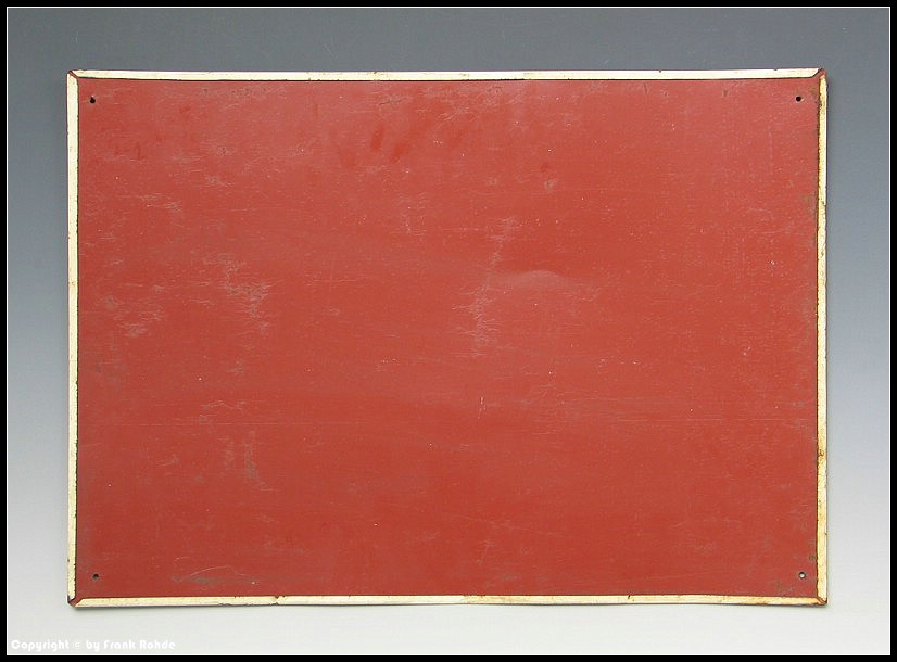 | Blechschild ist: | flach mit umgefalztem Rand, Oberfläche ist vorn mit einer dünnen Schicht Kunststoff überzogen (ist Original so), wird auch Imoglas genannt. |