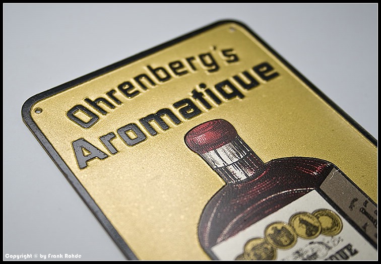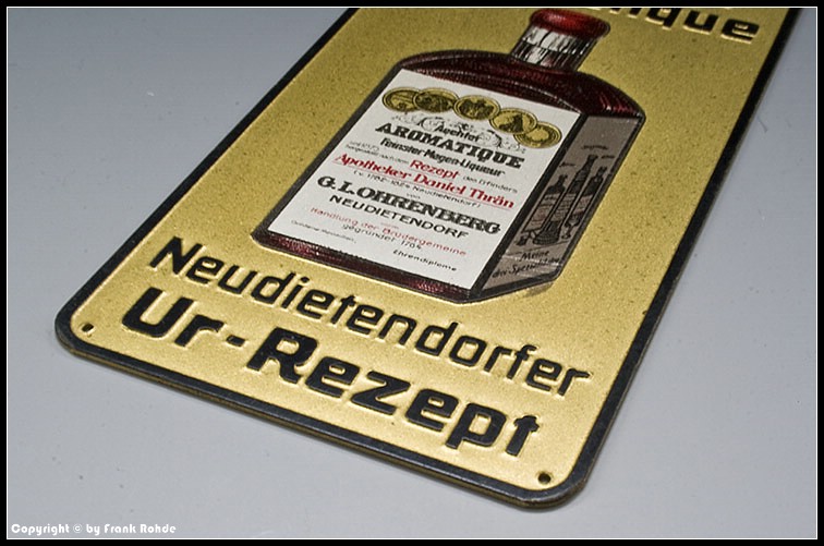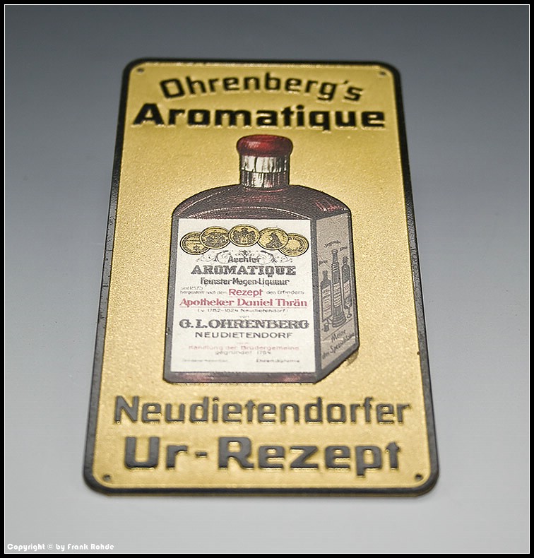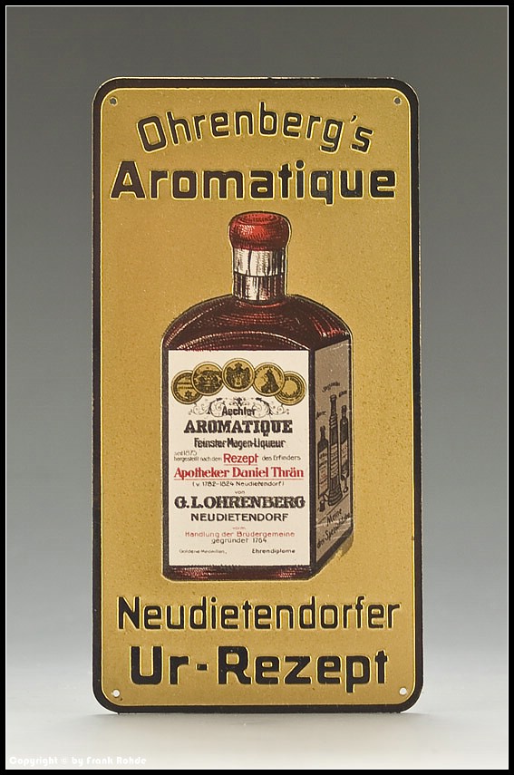 Blech Türschild "Ohrenberg`s Aromatique Feinster-Magen Liqueur Neudietendorfer Ur-Rezept" (Nr.: BL 6) |