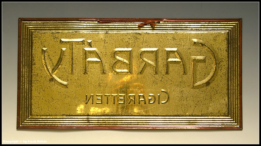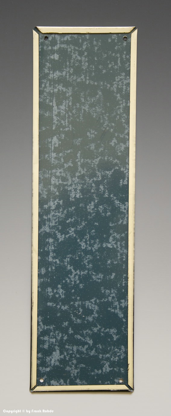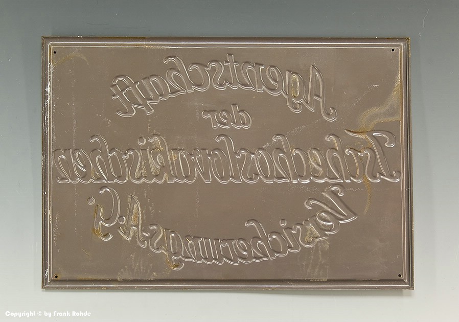 | Blechschild ist: | flach mit stark negativ geprägter Schrift und Rand |