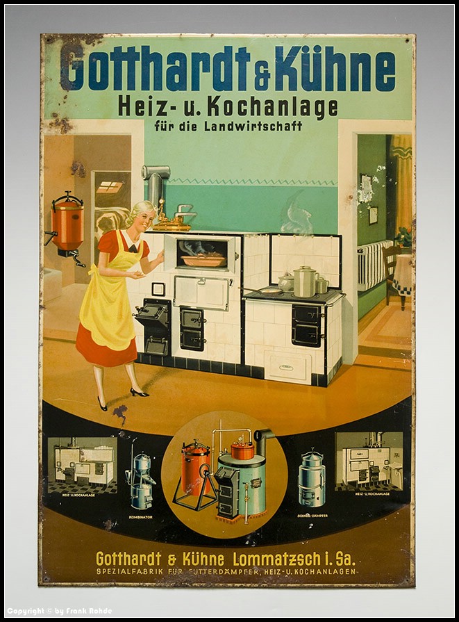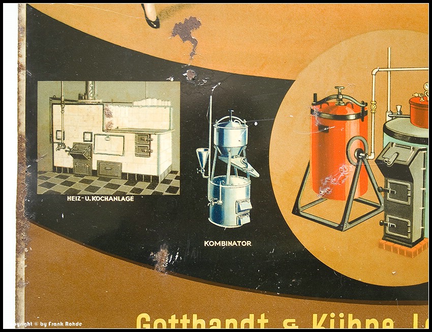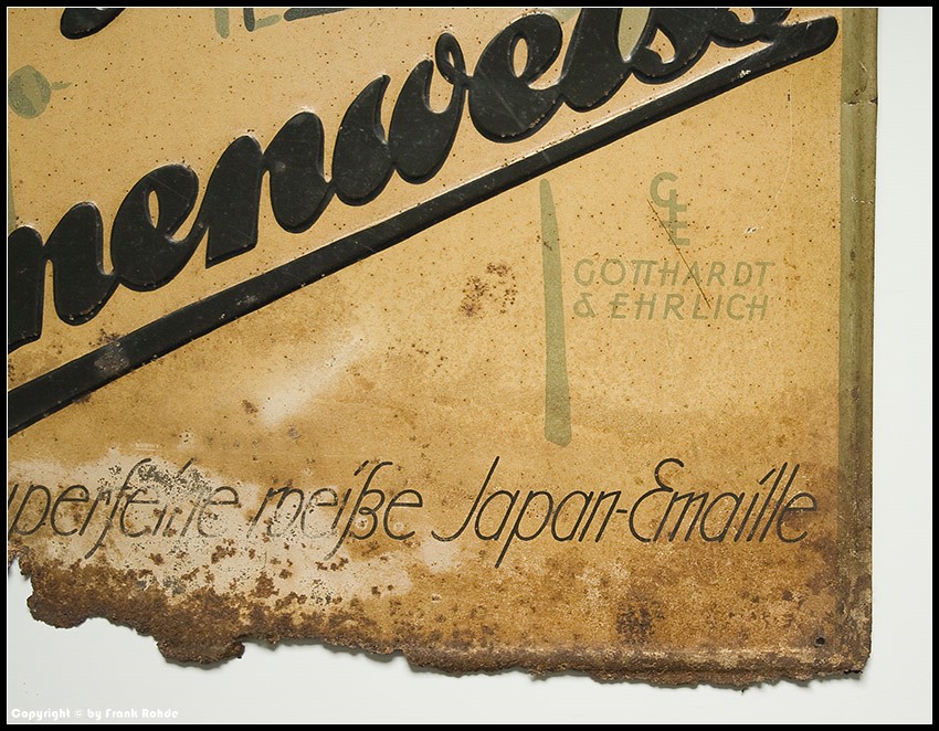 | Besonderheiten: | das Schild befindet sich in ungereinigtem Fundzustand ! Es handelt sich hier um ein sehr selten angebotenes Schild, uns ist kein weiteres Exemplar in dieser Ausführung bekannt ! Insgesamt ein sehr kurioses Stück. Der Entwurf erinnert stark an Ludwig Hohlwein, das Schild ist jedoch im Bereich rechts unten mit: GOTTHARDT & EHRLICH signiert |