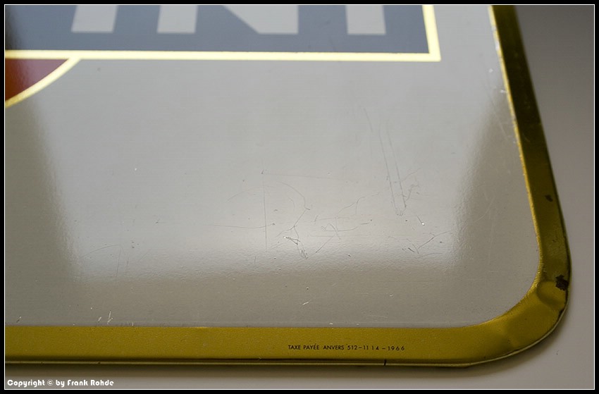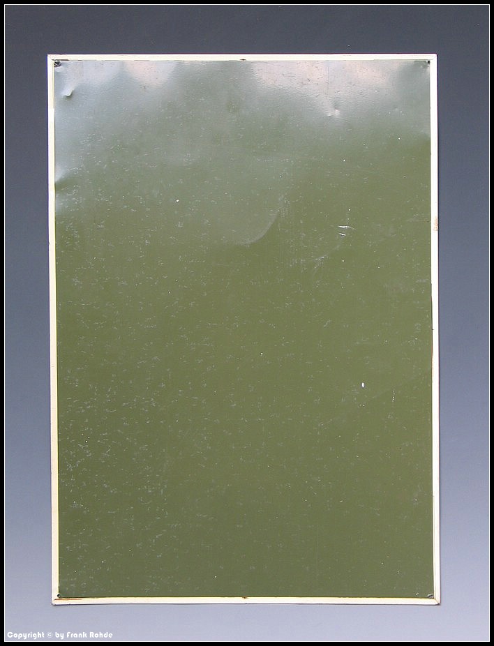 | Blechschild ist: | flach mit umgefalztem Rand. Oberfläche ist vorn mit einer dünnen Schicht Kunststoff überzogen (ist Original so, Herstellername "Imoglas") |