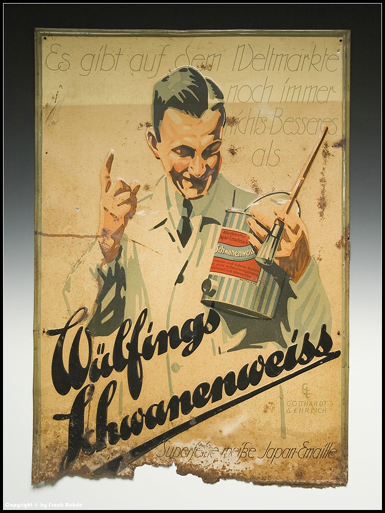Blechschild "Es gibt auf dem Weltmarkte noch immer nichts Besseres als Wülfings Schwanenweiss Superfeine weiße Japan-Emaille" (Nr.: BL 41) ...VERKAUFT ! |