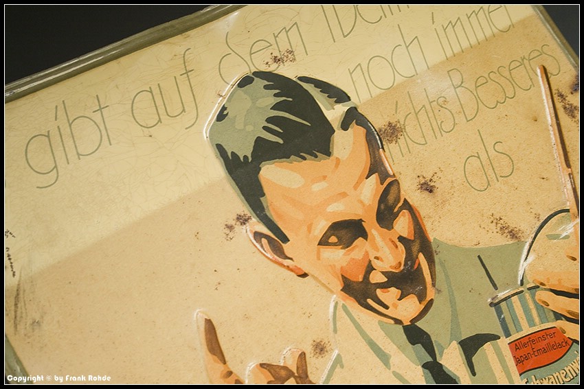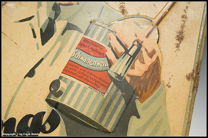| Beschädigungen: | Schild hat minimale altersbedingte Lagerspuren. Die Oberfläche hat zahlreiche kaum sichtbare Beanstandungen durch das Alter (vom Papier...siehe weiter unten angegeben). Der abstehende Zeigefinger weist eine Knickspur auf, ebenso der äußerste Rand des Ellbogens (Herstellungsbedingt). Eine punktuelle minimale Delle in Höhe der Taille der Dame im blau, sonst nichts verbeult oder Hin und Hergebogen... |