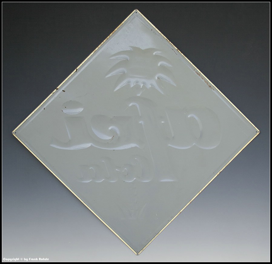 | Besonderheiten: | Das Schild ist vorn mit dünnem Kunststoff überzogen. Rückseite mit eingelegter Pappe. Ungewöhnliches Teil...! |