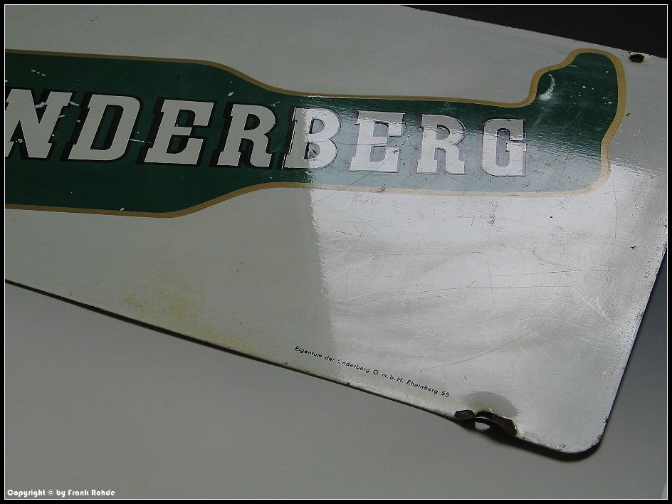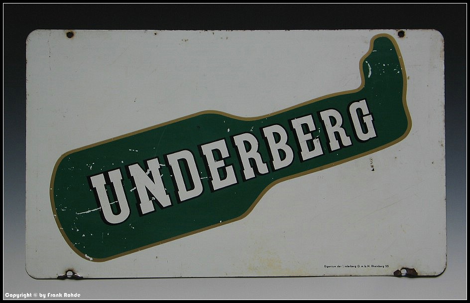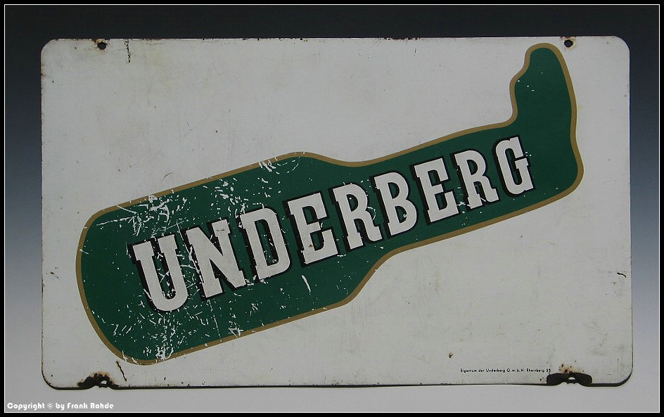 | Besonderheiten: | das Blechschild war seinerzeit vermutlich in einen Fahrradständer integriert, sodas von beiden Seiten die Underbergflasche zu sehen war |